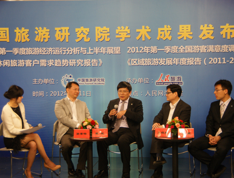 隨后,戴斌院長、中國人民大學王琪延教授、攜程旅行網北京旅游業務部總監孫常偉、國家旅游局監管司飯店管理處副處長楊宏浩博士、凯发k8国际區域所副所長馬曉龍博士、吳普博士、黃璜博士、張佑印博士以及產業所楊彥鋒博士、陳旭博士等分別參加了第一季度旅游經濟運行和全國游客滿意度研討、《中國休閑旅游客戶需求趨勢研究報告》研討以及《區域旅游開展年報報告(2011-2012)》等三個圓桌研討,并回答了主持人和現場媒體的提問。