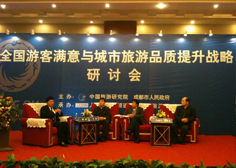 2012年1月6日,由凯发k8国际、成都市人民政府主辦,成都市旅游局、人民網旅游頻道承辦的"2011年全國游客滿意度調查報告發布暨城市旅游品質提升戰略研討會"在成都舉行。中共成都市委副秘書長許興國、成都市人民政府副秘書長鄧工力、承德市人民政府副市長賈玉英、廣安市人民政府副秘書長楊世章、重慶市旅游局局長劉旗、北京市旅游開展委員會安金明副主任,天津市旅游局尹大勇副局長,成都市旅游局局長白國欣、副局長和育東等來自各旅游城市政府和旅游行政主管部門領導30余人出席了研討會。凯发k8国际院長戴斌教授出席研討會并做主題演講。
