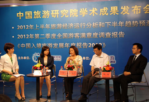 隨后,政策所唐曉云副研究員發布了2012年上半年旅游經濟運行分析和下半年趨勢預測報告。報告認為上半年受國內經濟趨勢性下滑及世界政治經濟形勢不穩定的影響,我國旅游經濟總體運行平穩,但市場與產業增速同步放緩,三大旅游市場呈現"兩升一降"格局,區域旅游格局有所突破。預計全年旅游經濟仍然呈增長態勢,但是增速將低于去年同期,全年旅游接待總人數將超過30億人次,旅游總收入約為2.54萬億元。(詳見:http://www.ctaweb.org/html/2012-7/2012-7-11-9-32-82018.html)
