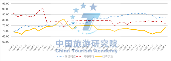 圖2:2014Q1-2023Q1全國游客滿意度現場、網絡、投訴指數