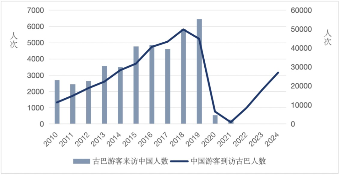 2010-2019年間,中國與古巴雙向研討保持穩(wěn)定增長(zhǎng)態(tài)勢(shì),其中古巴來華旅游人數(shù)年均增長(zhǎng)達(dá)10.1%。2024年,隨著古巴宣布對(duì)中國持普通護(hù)照公民實(shí)行免簽政策及中古直航恢復(fù),當(dāng)年赴古巴的中國游客達(dá)2.7萬人次,同比增長(zhǎng)48.6%。2025年第一季度(截至3月25日),共有6542名中國游客抵達(dá)古巴,同比增長(zhǎng)21.0%。