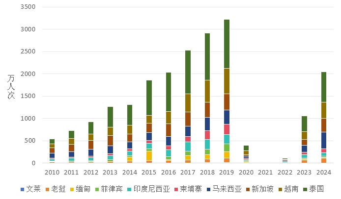 注:疫情期間數據不顯示;2023-2024年,文萊、柬埔寨和菲律賓來華旅游數據缺失;2016年以后入境旅游統計數據包括邊境旅游。
