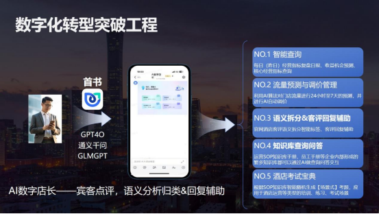 二是數字化轉型突破工程。首旅集團持續構建數字化建設與人工智能深度融合的新格局,推進數字化生態平臺項目,有助于AI技術與企業經營管理相結合。集團旗下環球影城應用了客流預測系統,實現了園區動態調控,能夠容納單日最高游客5.5萬人次,還能讓游客有一個很好的體驗。首旅酒店打造的“數字店長”項目順利獲得接入人工智能大模型,建設了酒店運營的智能體,現在能夠承擔酒店門店60%的復雜性、基礎性、重復性的工作。