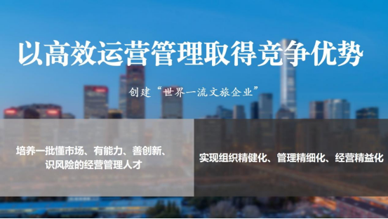 二是以高效運營管理取得競爭優勢。當前,我們正在錨定目標,創建世界一流文旅企業,而高效的運營管理正是實現這一目標的基礎。我們將繼續有助于經營與管理之間的良性互動,解決好傳統產業轉型升級與新型業態不均衡開展的問題,培育一批懂市場、有能力、善創新、識風險的經營管理人才,有助于企業經營能力的整體提升。同時,我們進一步深入有助于組織改革,不斷強化成本控制、盈利能力、產業結構、市場營銷等各方面的能力建設,持續推進深化國企改革提升行動,實現集團組織的精簡化、管理的精細化、經營的精益化,不斷激發企業活力。